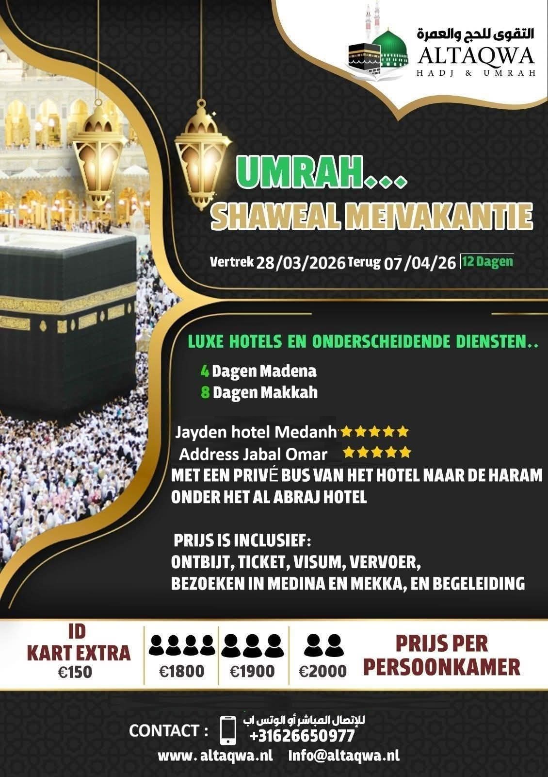 Ontbijt, vliegticket, visum, transport, bezoeken in Medina en Mekka, Tawaf,